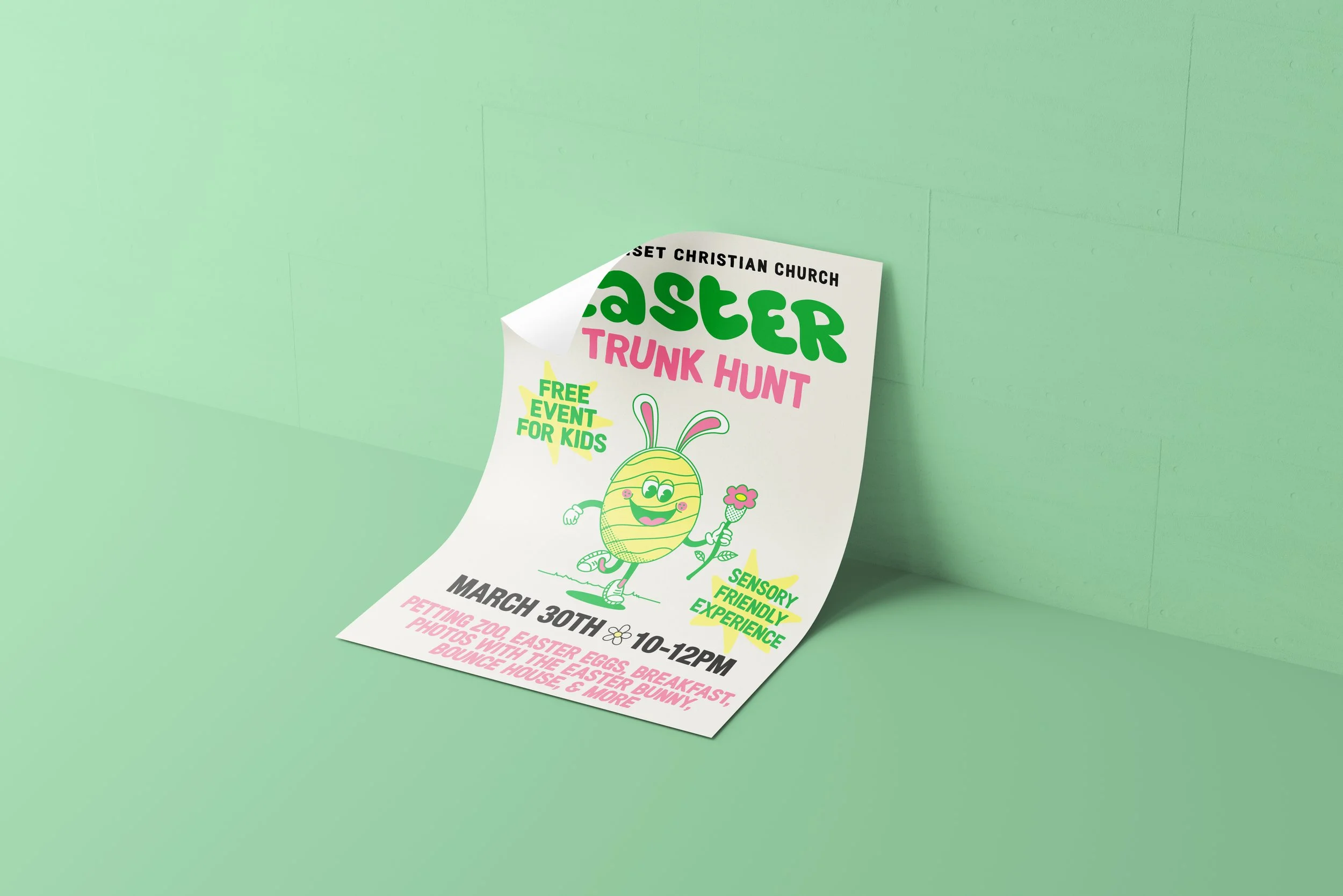 Before I start designing, I usually begin with a mood board. However, for this project, I started by sketching. I created an Easter Egg Mascot with bunny ears and fell in love with the concept. From there, I developed various design elements and assets and created a cohesive color palette.