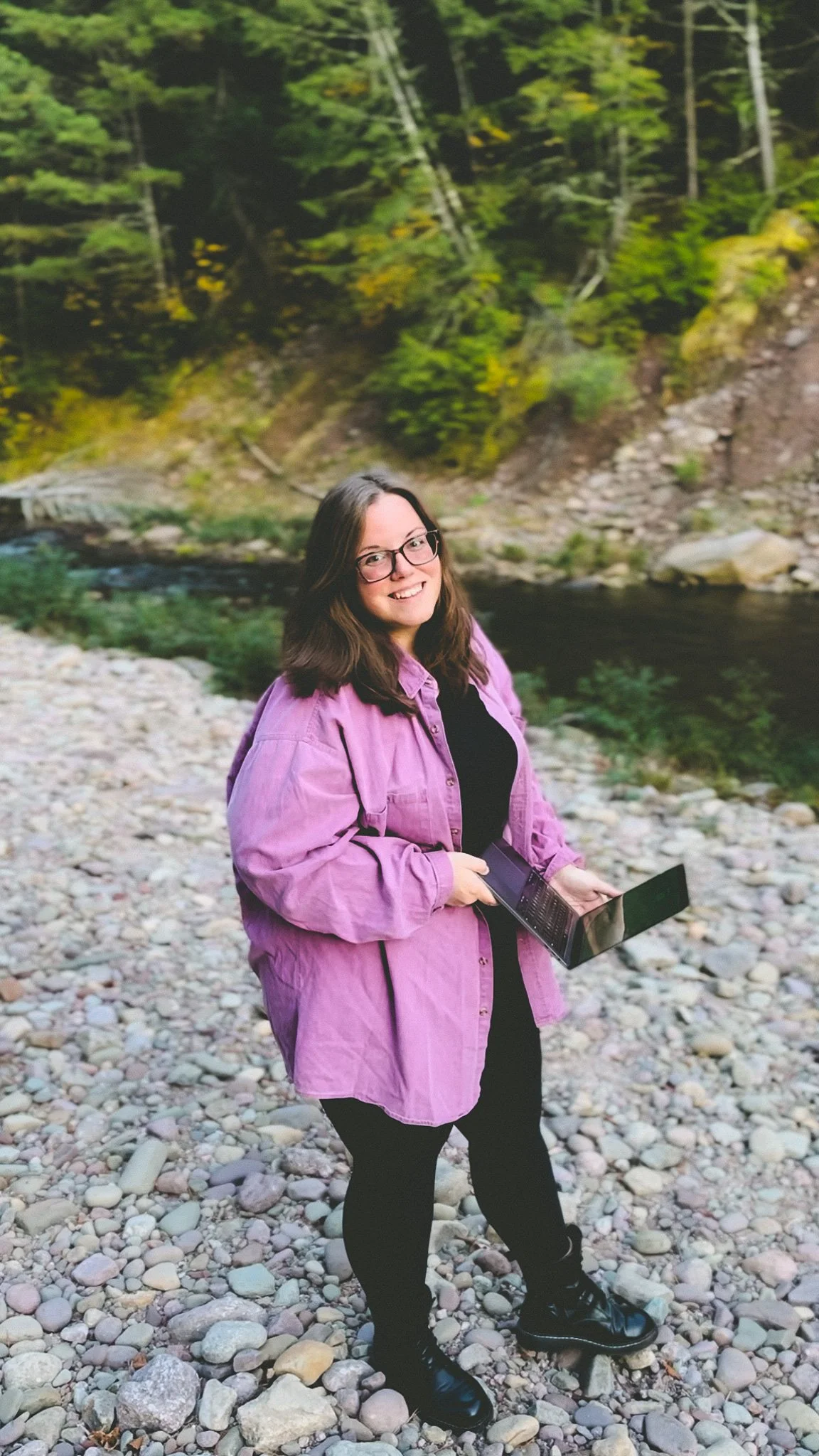 Paxton by a creek drawing on her ipad smiling looking at the camera