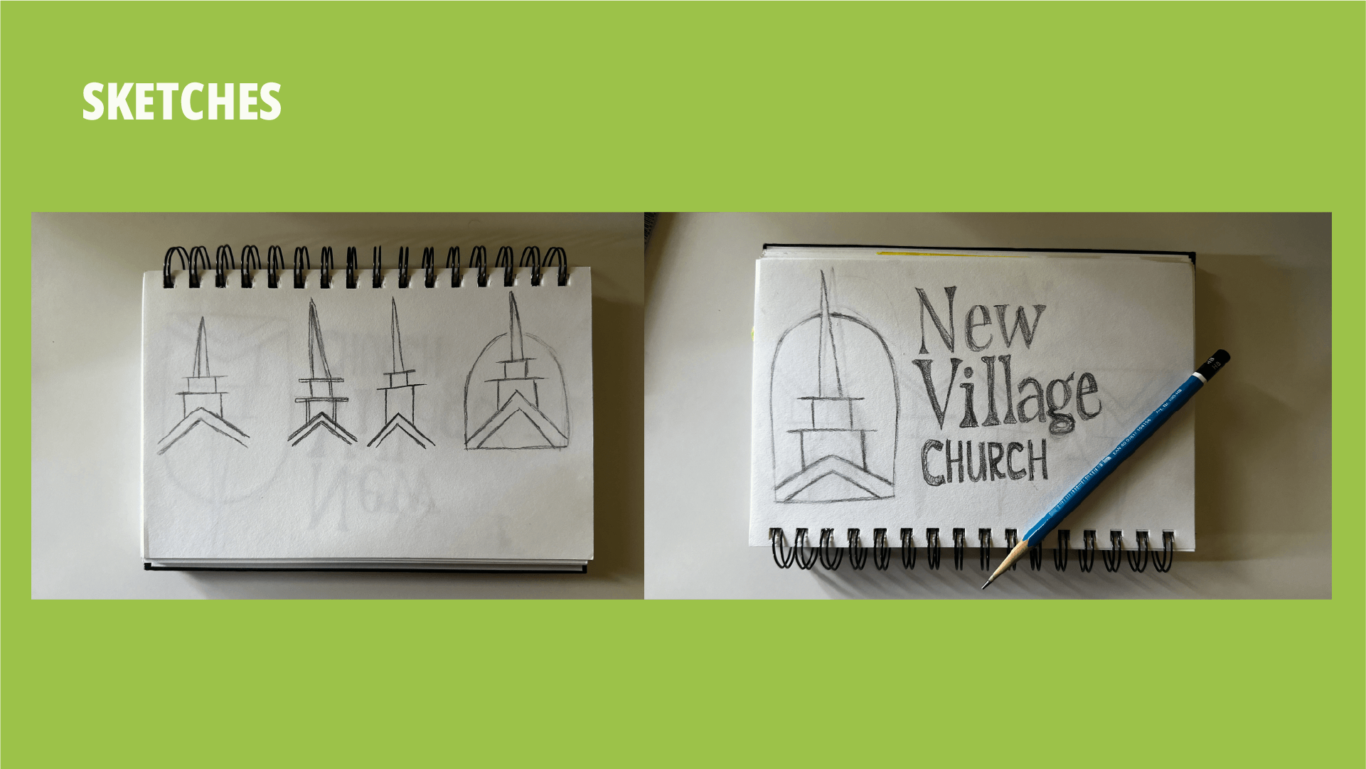 The design process began by re-envisioning the steeple from a centered front view, giving the logo a stronger, more iconic presence while still honoring the quirky crookedness of the original structure. This new angle created a bold, balanced mark that could stand alone or pair seamlessly with type.